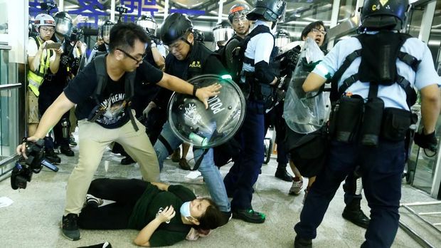 Demonstrasi di bandara semakin tidak kondusif pada awal pekan ini hingga memaksa otoritas membatalkan seluruh penerbangan dari dan menuju Hong Kong pada Senin (12/8).