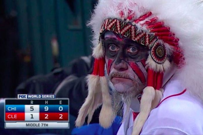 But you probably shouldn’t be lauding MLB, or the people who run the team, as a hero. The franchise has dug its feet in on the name, and Chief Wahoo, for decades — Native American activist Russell Means brought a lawsuit over the logo way back in 1972 — and current owner Larry Dolan once said, about those protesting the name, “You can whip a group of non-thoughtful people to come up and protest anything” and “I firmly reject that Wahoo is racist. I see that it makes some Natives uncomfortable — clearly not all. I think I understand racism when I see it.” It has only been in the last decade that the team started to reverse itself. In 2014 it began to actively step back from the Chief Wahoo logo, but I’d argue the real pivot point was during the 2016 World Series against the Chicago Cubs, when a record number of television viewers, enticed by the historic matchup between two famously tortured franchises, were constantly greeted with images like this one: