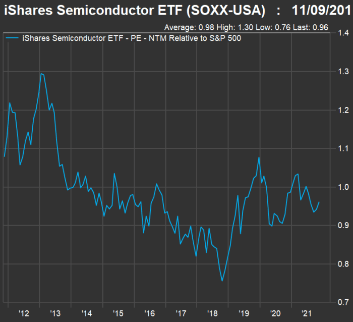 SOXX trades at a forward price-to-earnings ratio of 20.9, based on consensus estimates among analysts polled by FactSet, while the forward P/E for the S&P 500 Index SPX is 21.7. It’s not unusual for the semiconductors to trade at a discount. However, it is unusual for there to be a broad shortage of the industry’s products.